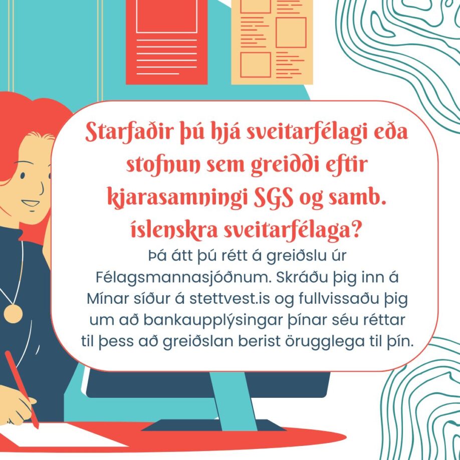 Allir félagsmenn sem störfuðu hjá sveitarfélagi eða hjá stofnunum sem greiða eftir kjarasamningi SGS við Samband íslenskra sveitarfélaga á árinu 2025 eiga rétt á greiðslu úr Félagsmannasjóði þann 1. febrúar nk. Í kjarasamningum sem samþykktur var í júlí 2024 var samið um að hækka mánaðarlegt framlag atvinnurekanda um 0,7% frá 1. apríl 2024 og fer hann því úr 1,5% í 2,2% af heildarlaunum einstaklings. Mikilvægt er að félagsmenn tryggi að réttar bankaupplýsingar liggi fyrir inn á Mínum síðum ásamt netfangi til að öruggt sé að greiðslan berist þeim. Viljum við sérstaklega hvetja félagsmenn sem störfuðu hjá Borgarbyggð eða Brákarhlíð á síðasta ári að fara yfir sínar bankaupplýsingar.